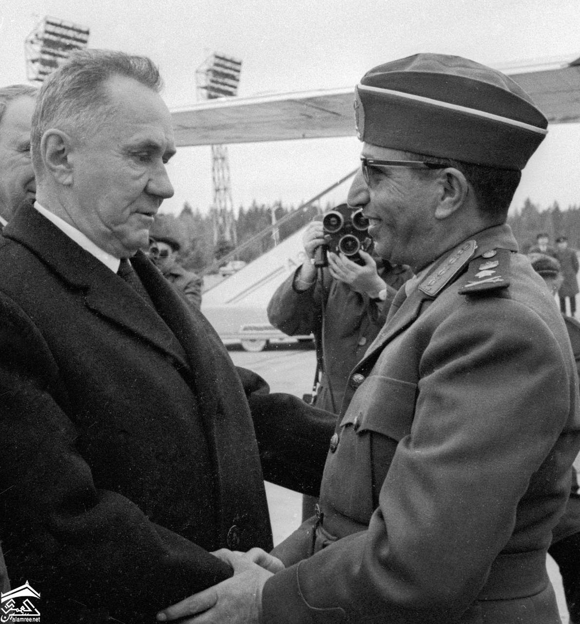 حسن العمري ، رئيس وزراء الجمهورية العربية اليمنية ، يصل في زيارة رسمية للاتحاد السوفيتي. أليكسي كوسيجين ، رئيس مجلس وزراء الاتحاد السوفياتي يحييه في مطار فنوكوفو ، موسكو في 3-1-1968م