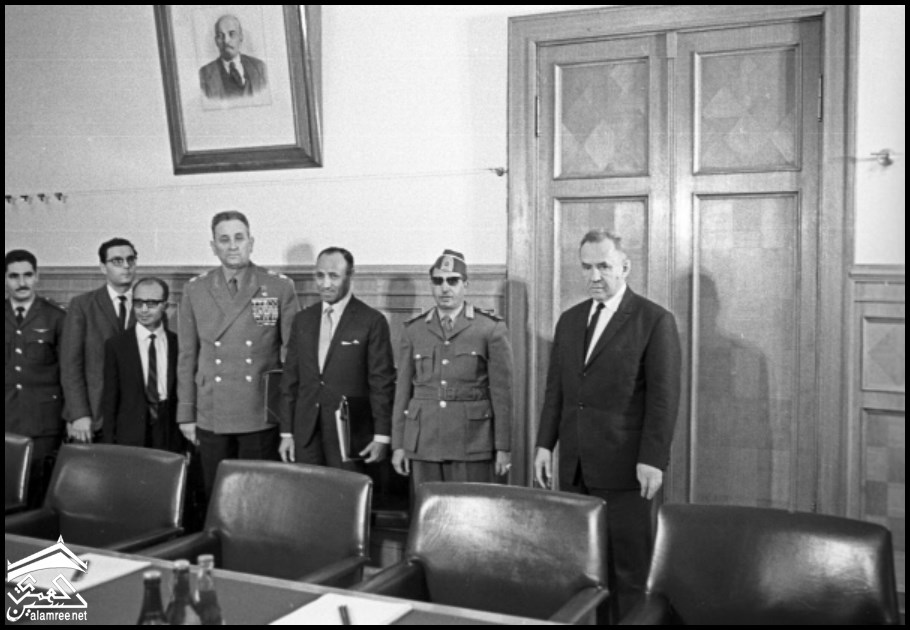 زيارة رئيس وزراء الجمهورية العربية اليمنية حسن العمري (اليمين الثاني) إلى الاتحاد السوفياتي. على اليمين - أليكسي كوسيجين ،رئيس مجلس وزراء الاتحاد السوفياتي.