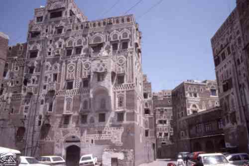 منازل متعددة الطوابق في صنعاء. تم تزيين جميع المنازل الترابية والطوبية