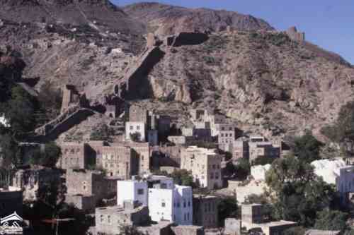 منظر للمنازل المبنية في سفح الجبل في تعز. تظهر المباني متعددة الطوابق المبنية من الطوب والأبيض على المنحدرات السفلية، مع جدار محصن يرتفع بشكل حاد حتى بقايا القلعة القديمة على الهضبة أعلاه.