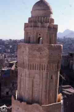 إحدى مآذن مسجد الأشرفية، ربما يمكن رؤيتها من المئذنة الأخرى. تظهر الأجزاء العلوية من المئذنة المثمنة، بما في ذلك الشرفة والقبة الطرفية. مدينة تعز تمتد في الخلفية