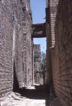 ثلا مباني شاهقة تصطف على جانبي شارع ضيق. جسر صغير يمتد عبر الزقاق بين مبنيين عام 1972-1980