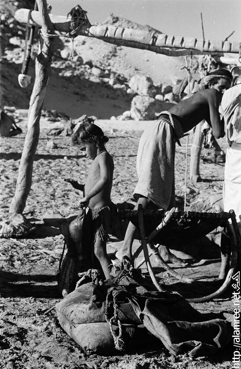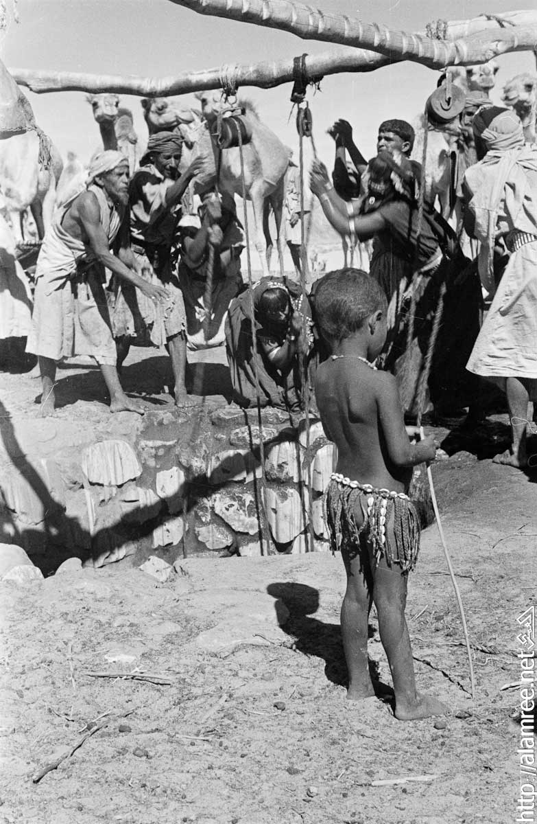 صوره لرجل وامراءه تستخدم حبل وبكرة خشبية لنقل المياه من البئر. في الخلفية الرجال الانتظار مع الإبل بالقرب من البئر .