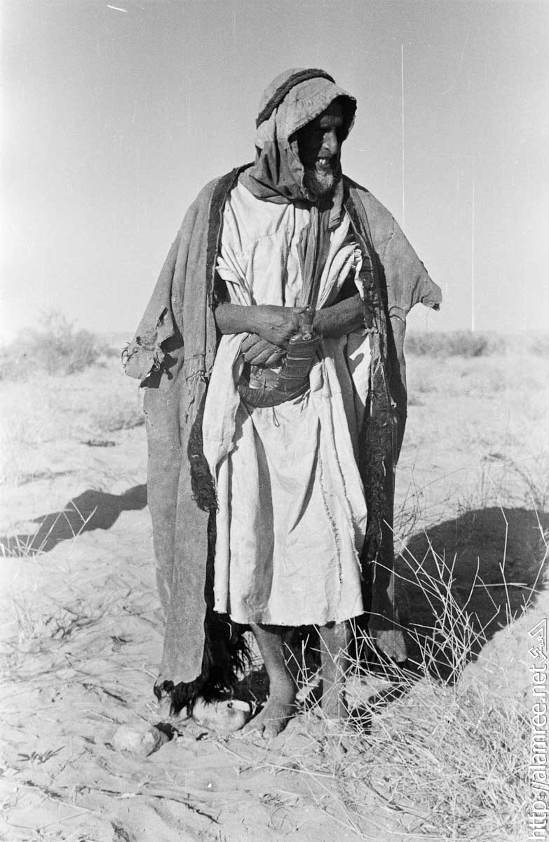 صورة لرجل كبير السن من سلالة بن معروف من بدو الصيعر في منوخ . وهو يرتدي عباءة جلد الغنم مع الفراء وخنجر في غمد على وسطه . .