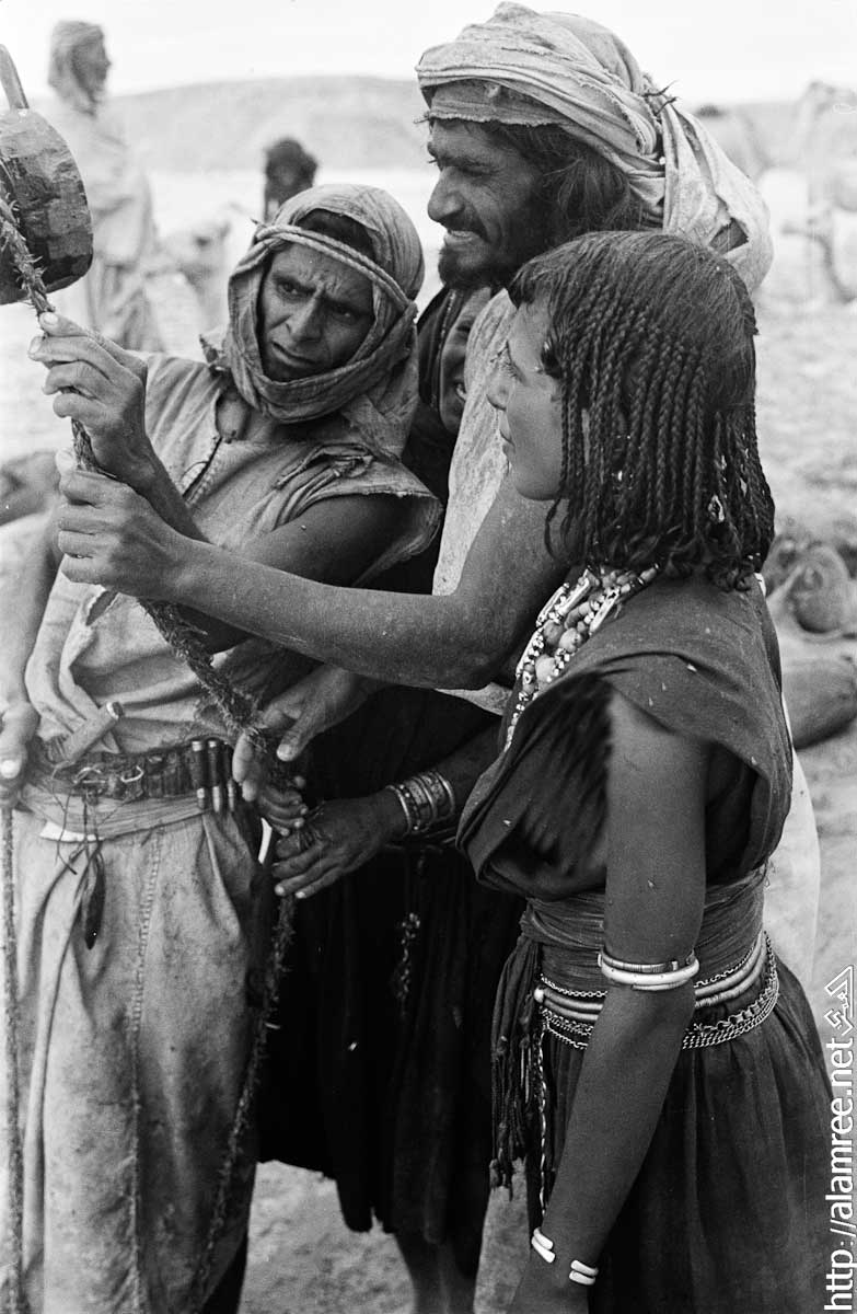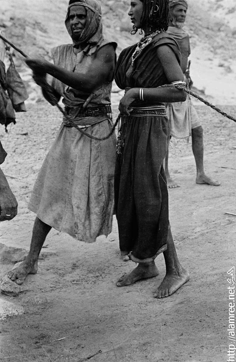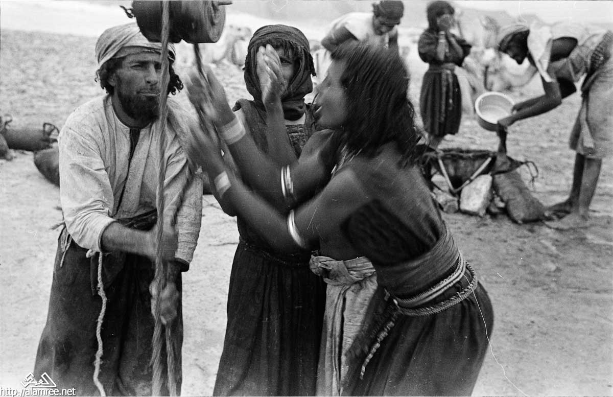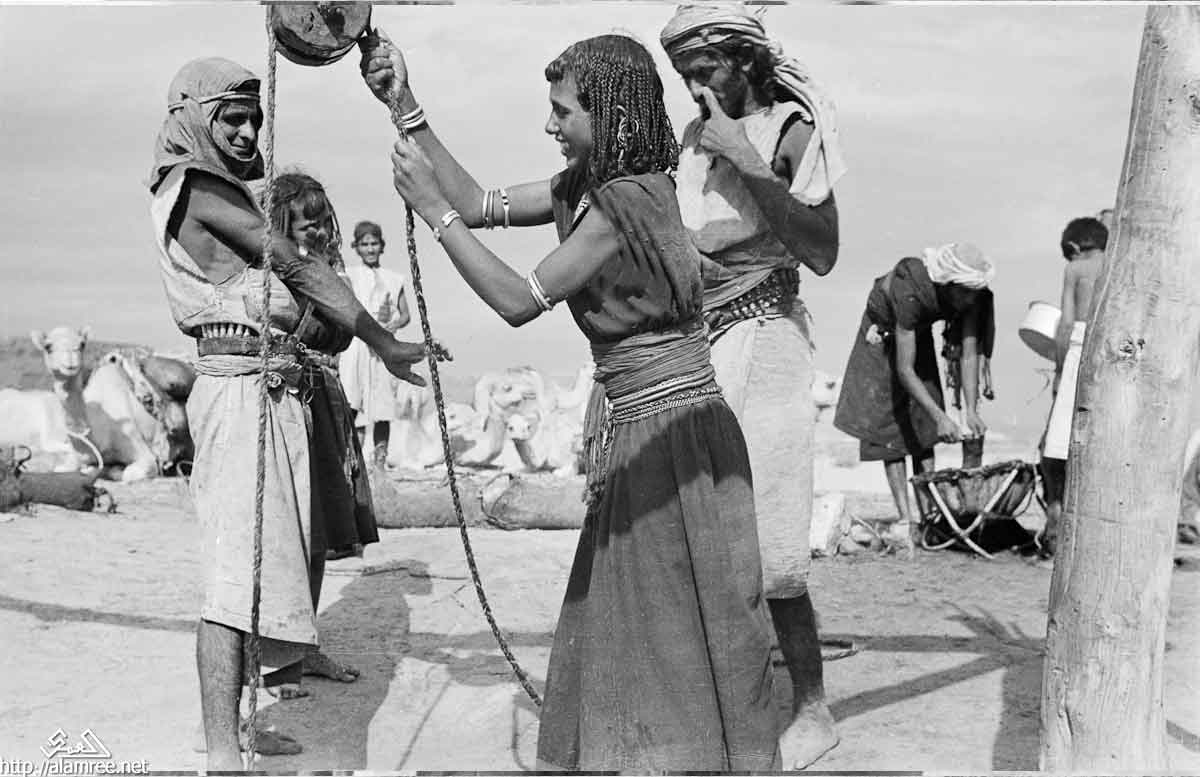 عرض من رجل و امرأة من بدو الصيعر ينزعون الماء من بئرفي منوخ . المرأة ترتدي أحزمة الفضة حول خصرها وعدد من القلائد والأصفاد