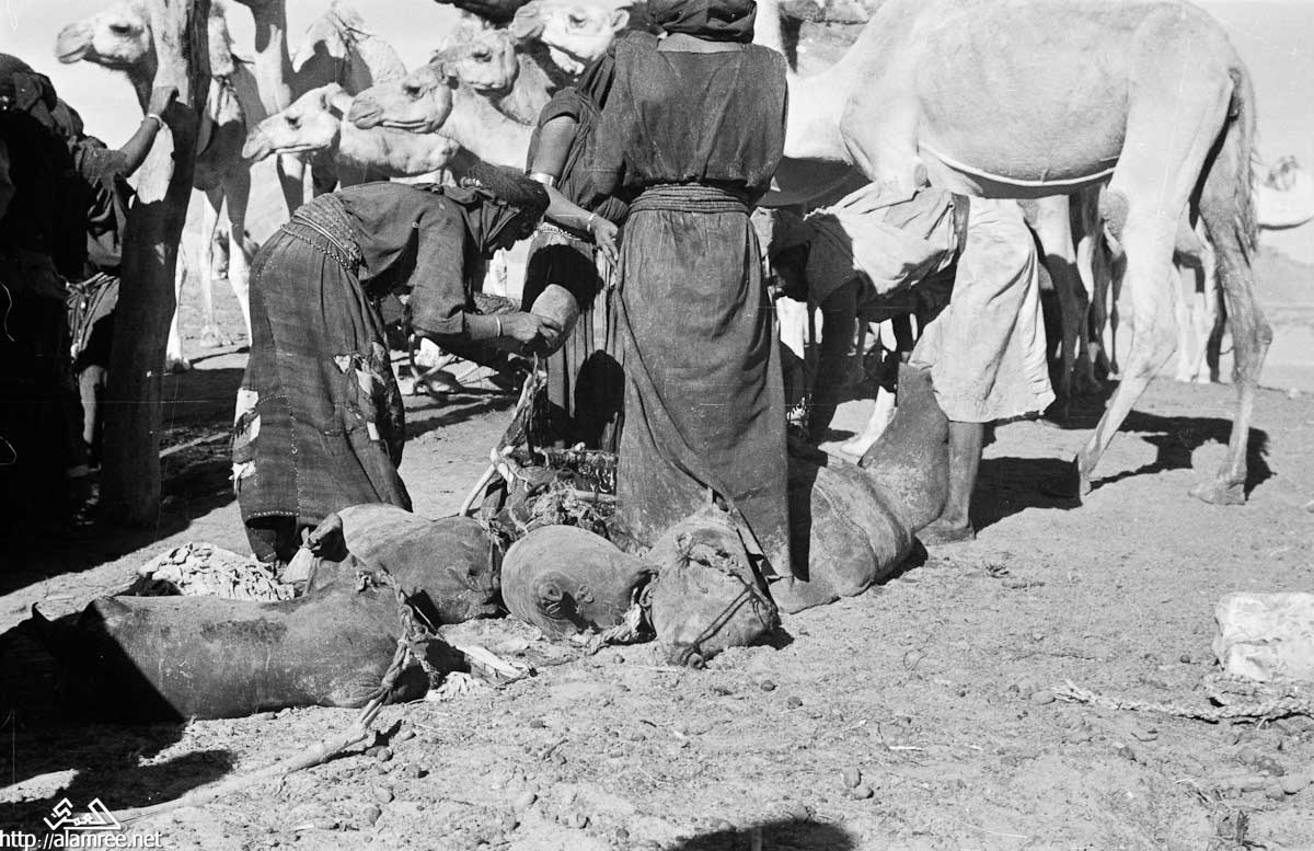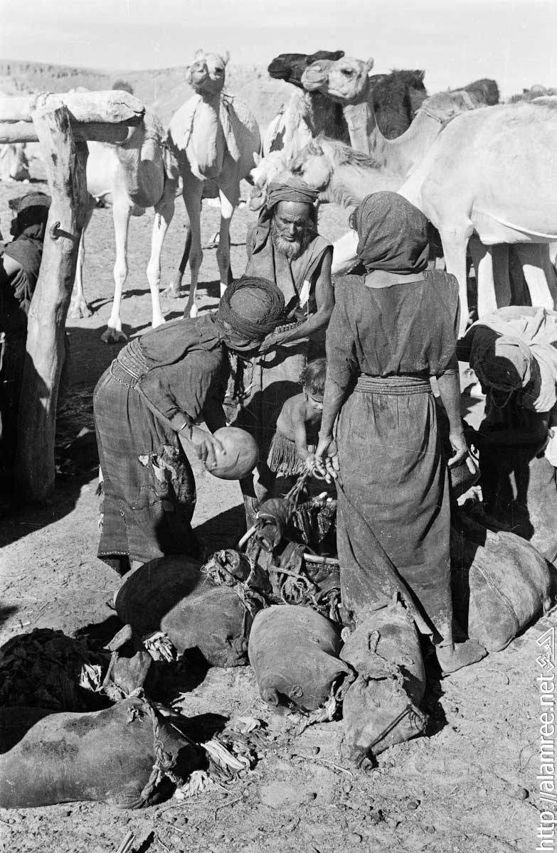 عرض لمجموعة بدو تسقي في منوخ . وتحفظ الماء في قرب من الجلد تقف في المقدمة. حشد من الابل في خلفيه الصوره