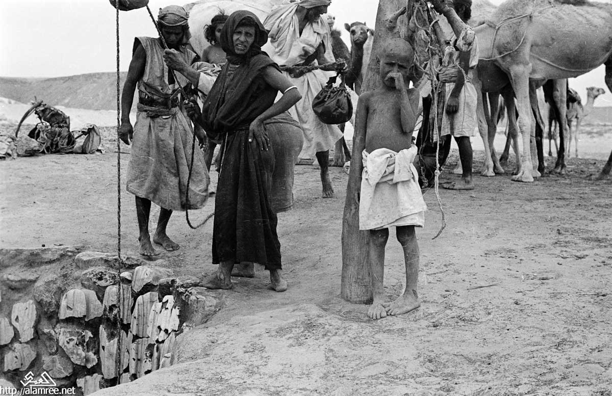عرض لمجموع من البدو تسقي جمالها من بئر في منطقة منوخ في ريدة الصيعر حضرموت