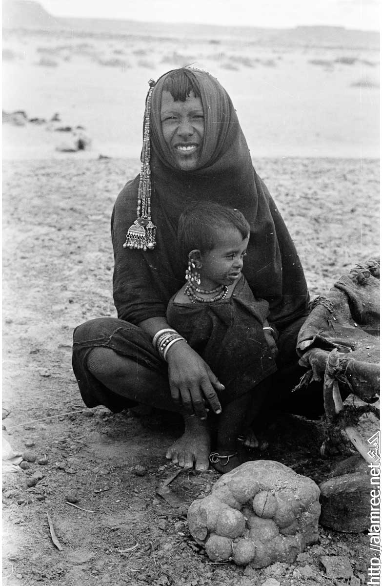 عرض لامرأة وفتاة تحمل طفل صغير يجلسوا على الأرض . وهم من جماعة البدو الصيعر في منوخ