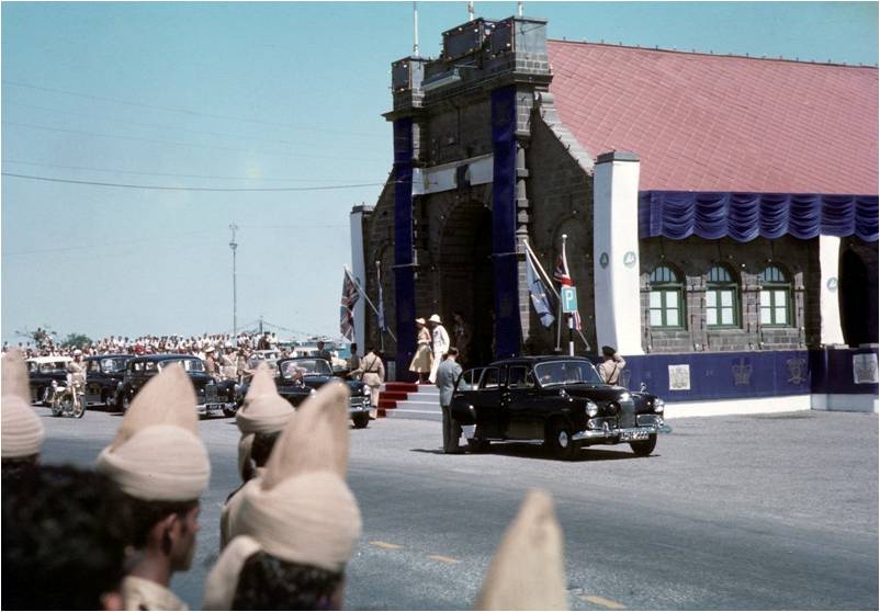 ملكة بريطانيا اليزابيت عند خروجها من بوابة الميناء اثناء زيارتها عدن