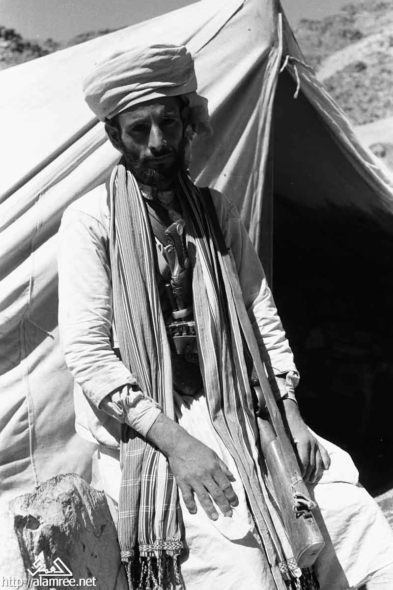 صورة لصبي وقف أمام بعض الخيام وممسكا ببندقية كبيرة ومعلوم استخدام الملكيين للاطفال في معاركهم