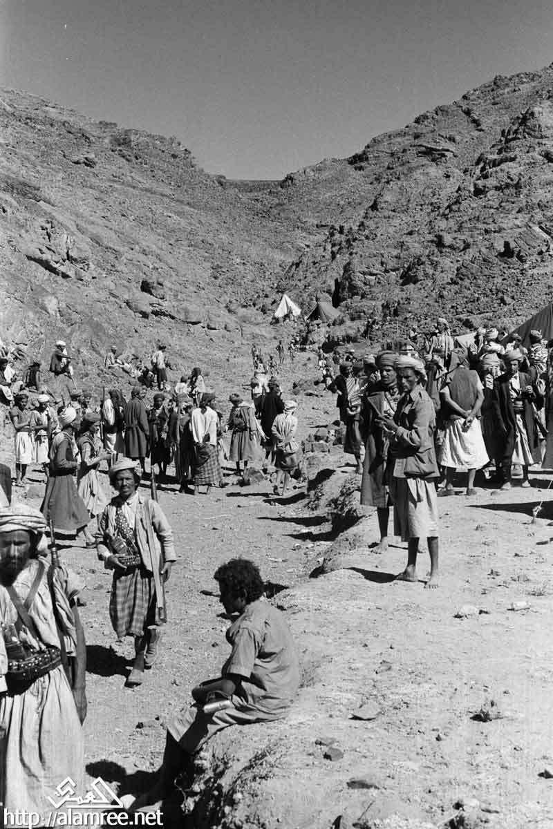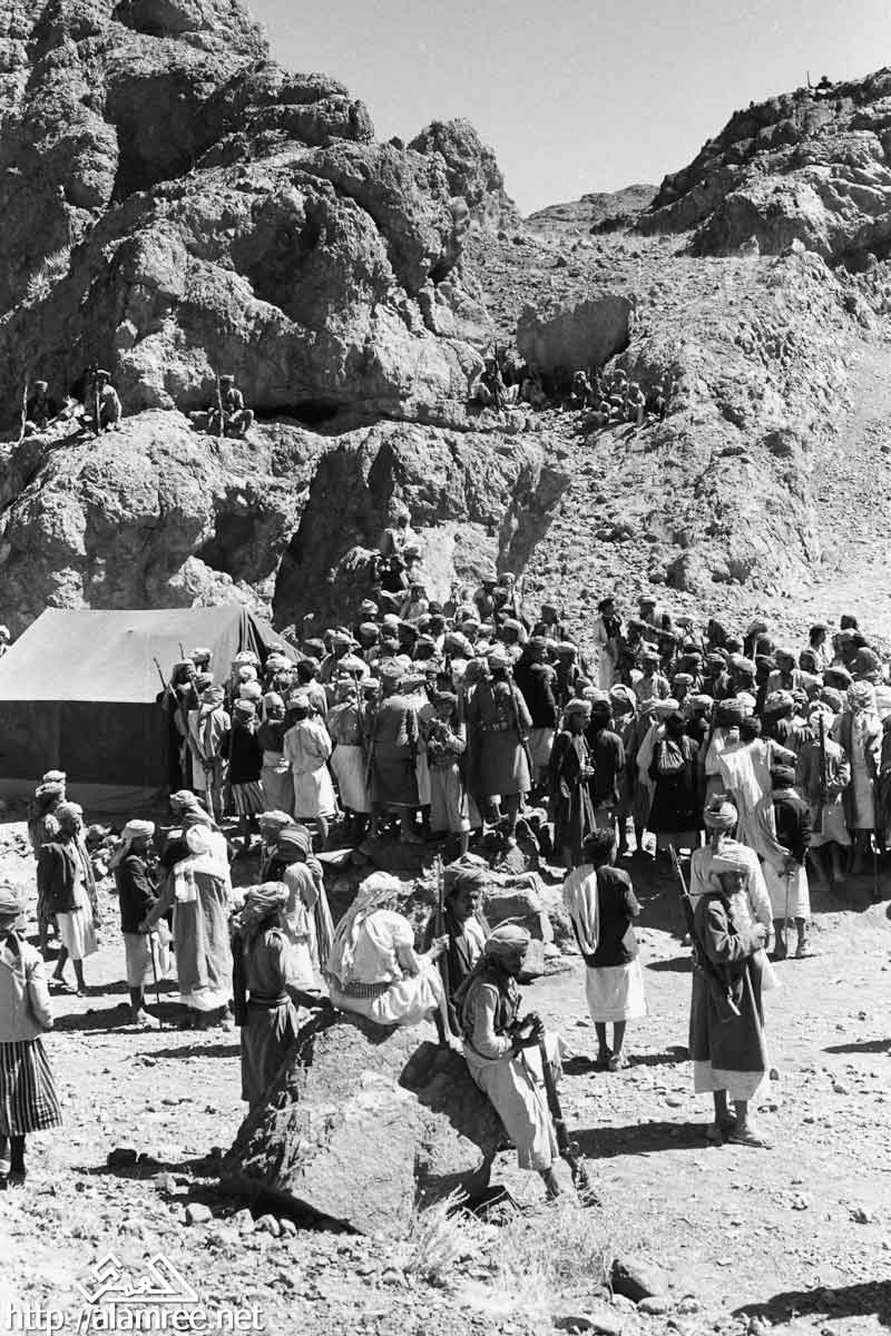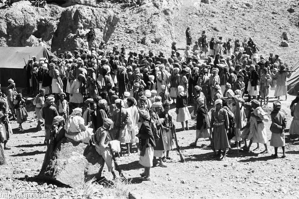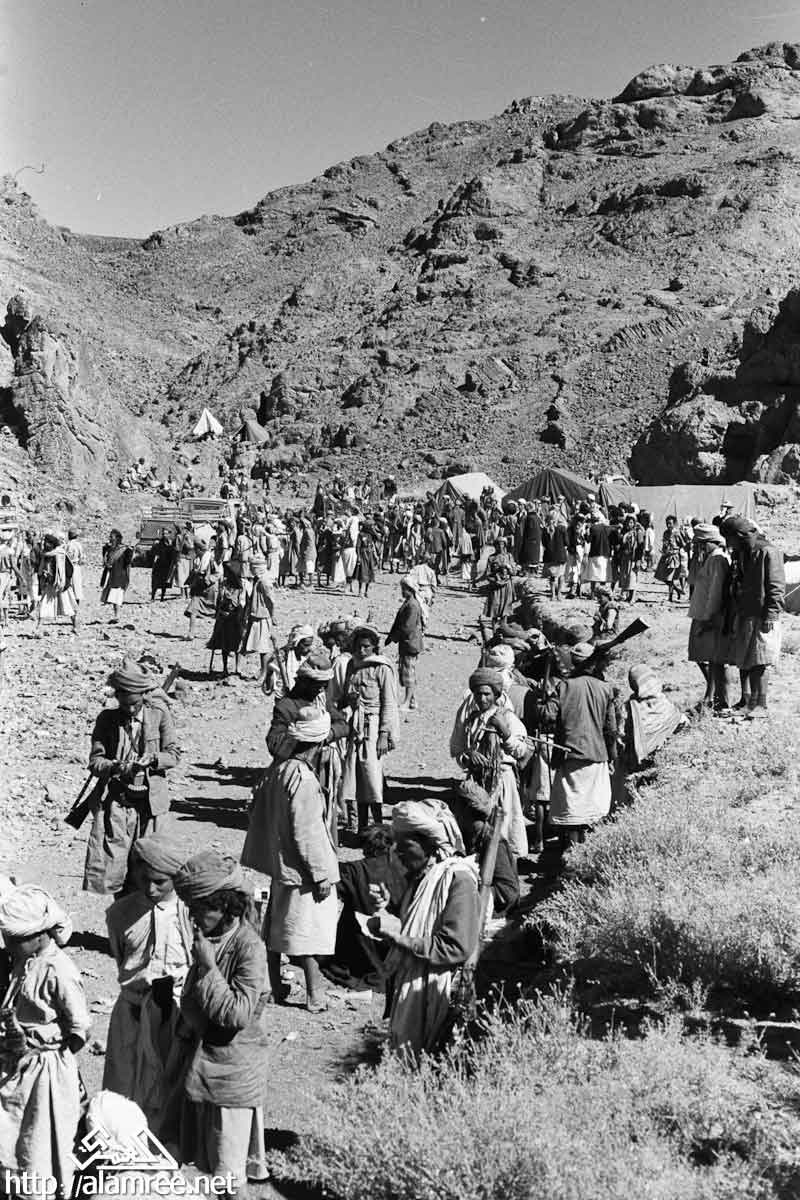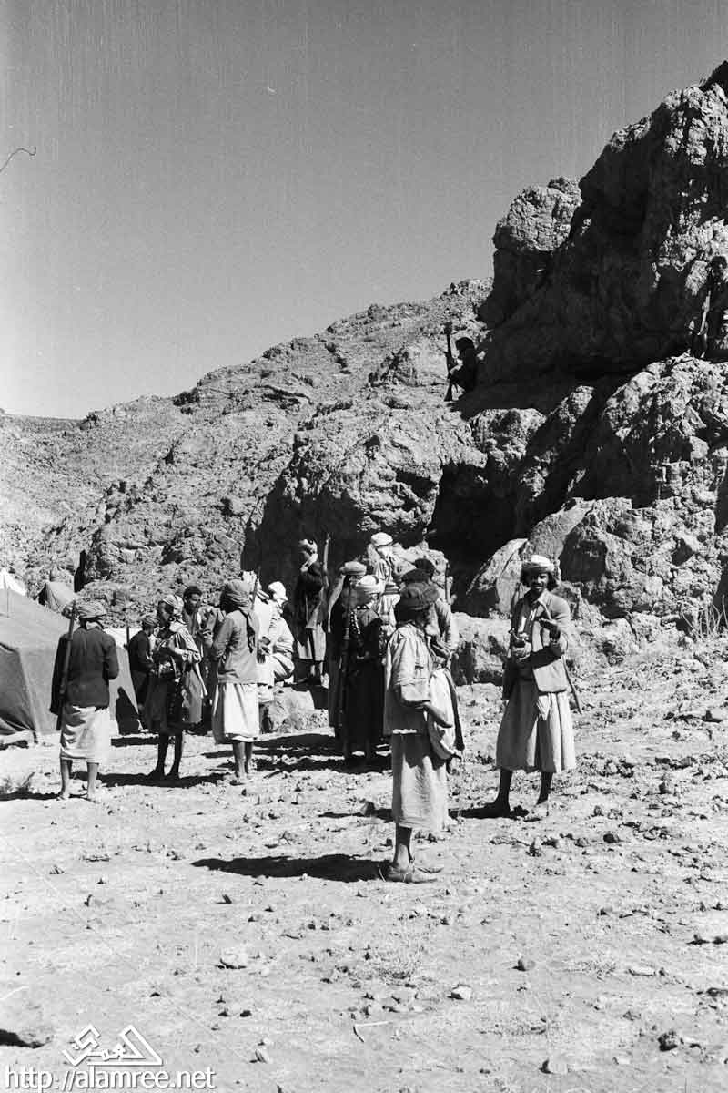 احد معسكرات الملكيين في واد صخري ويلاحظ حشد كبير من القوات الملكيه
