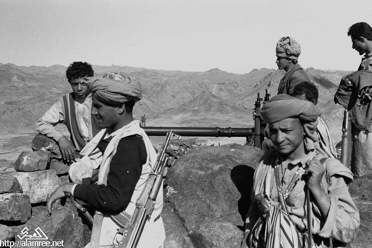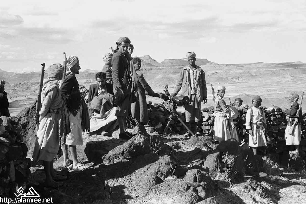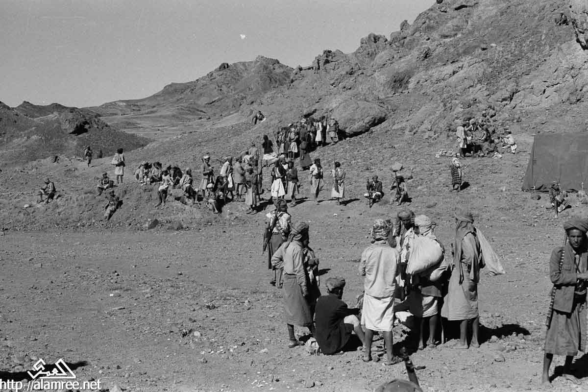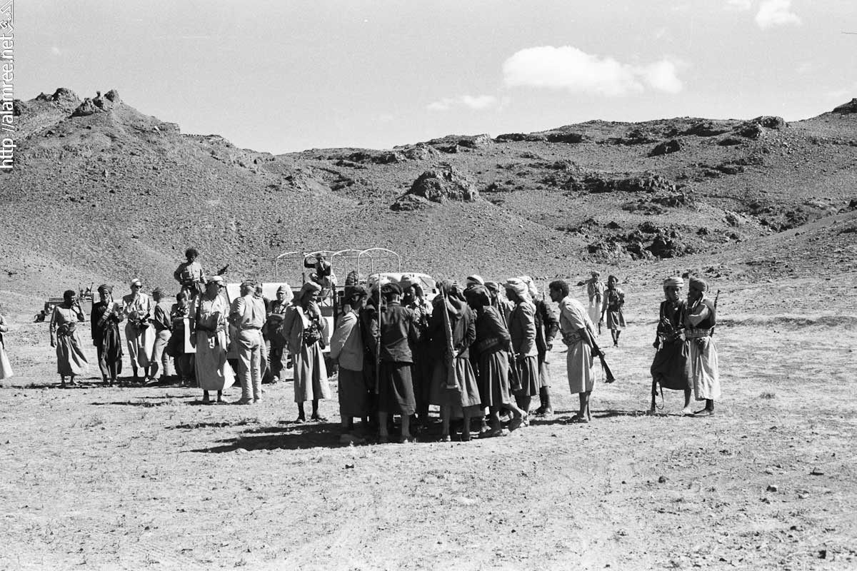 احد معسكرات الملكيين في واد صخري ويلاحظ حشد كبير من القوات الملكيه