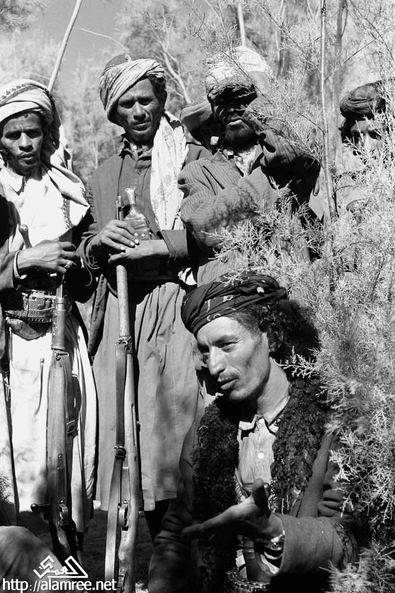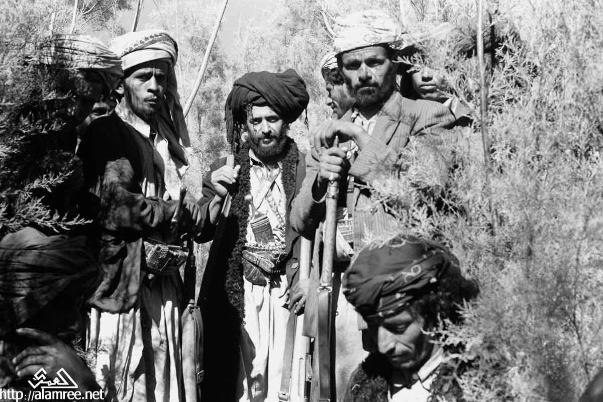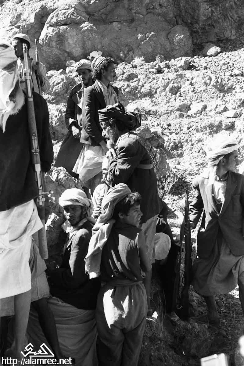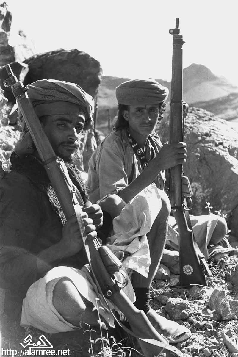صوره لعدة رجال مسلحين ببنادق والخناجر مغمده من داخل احد معسكرات الملكيين