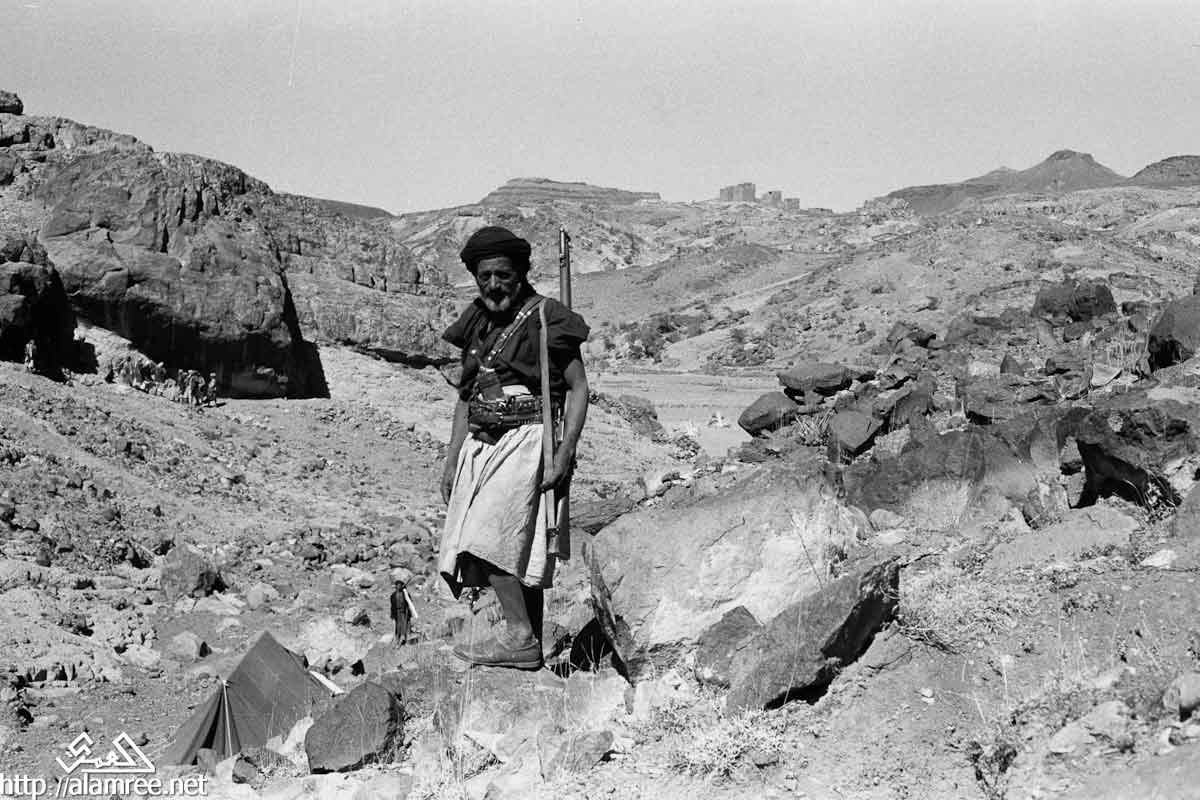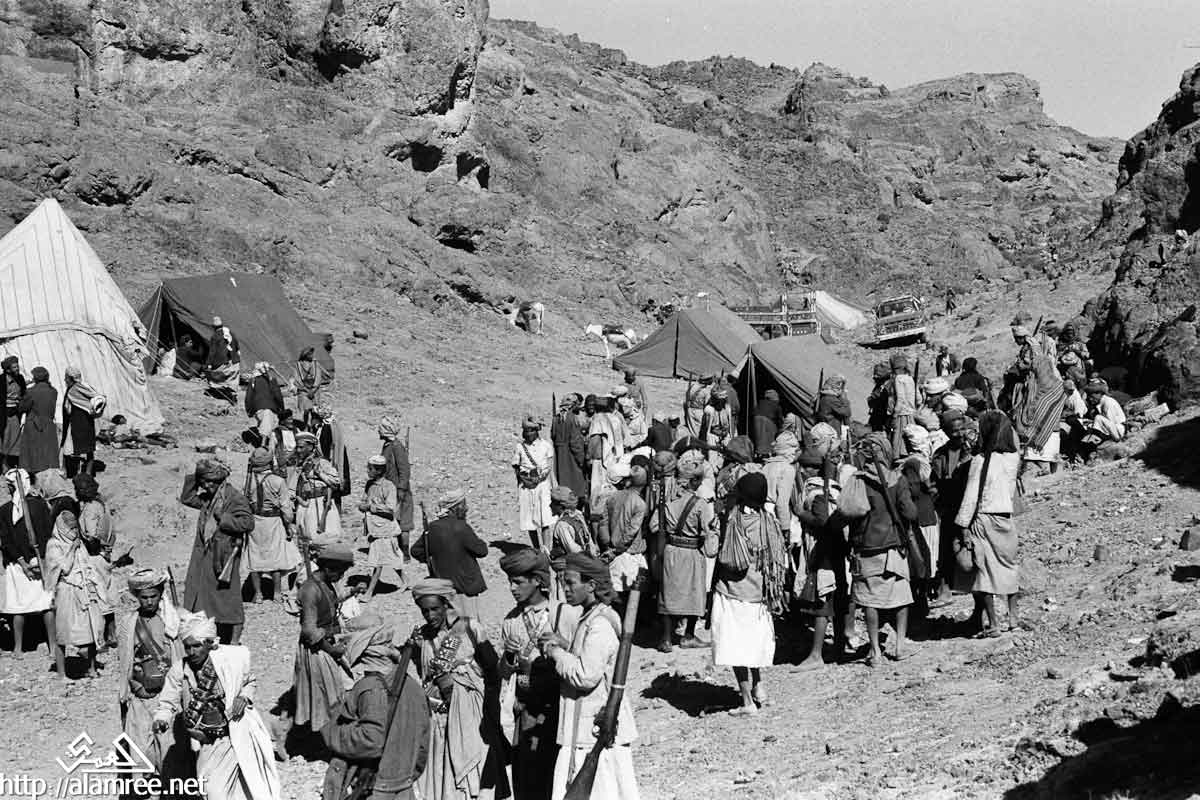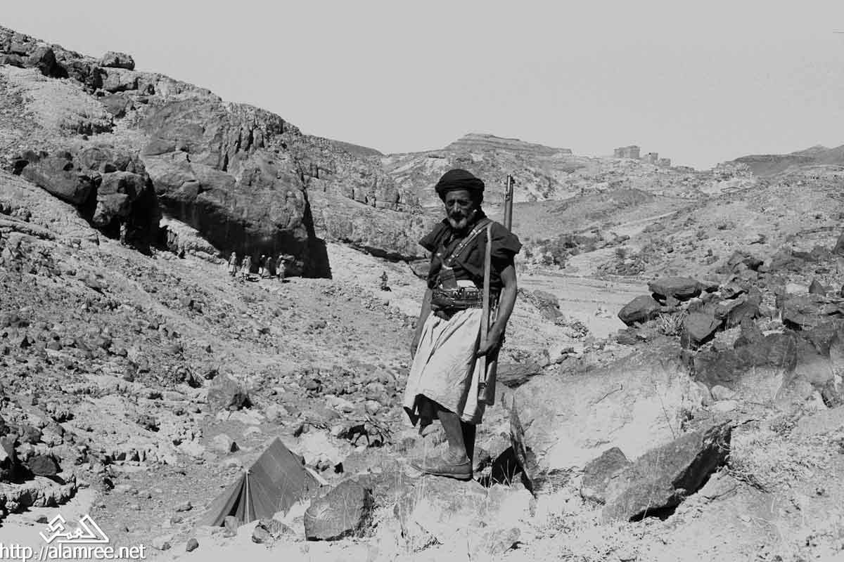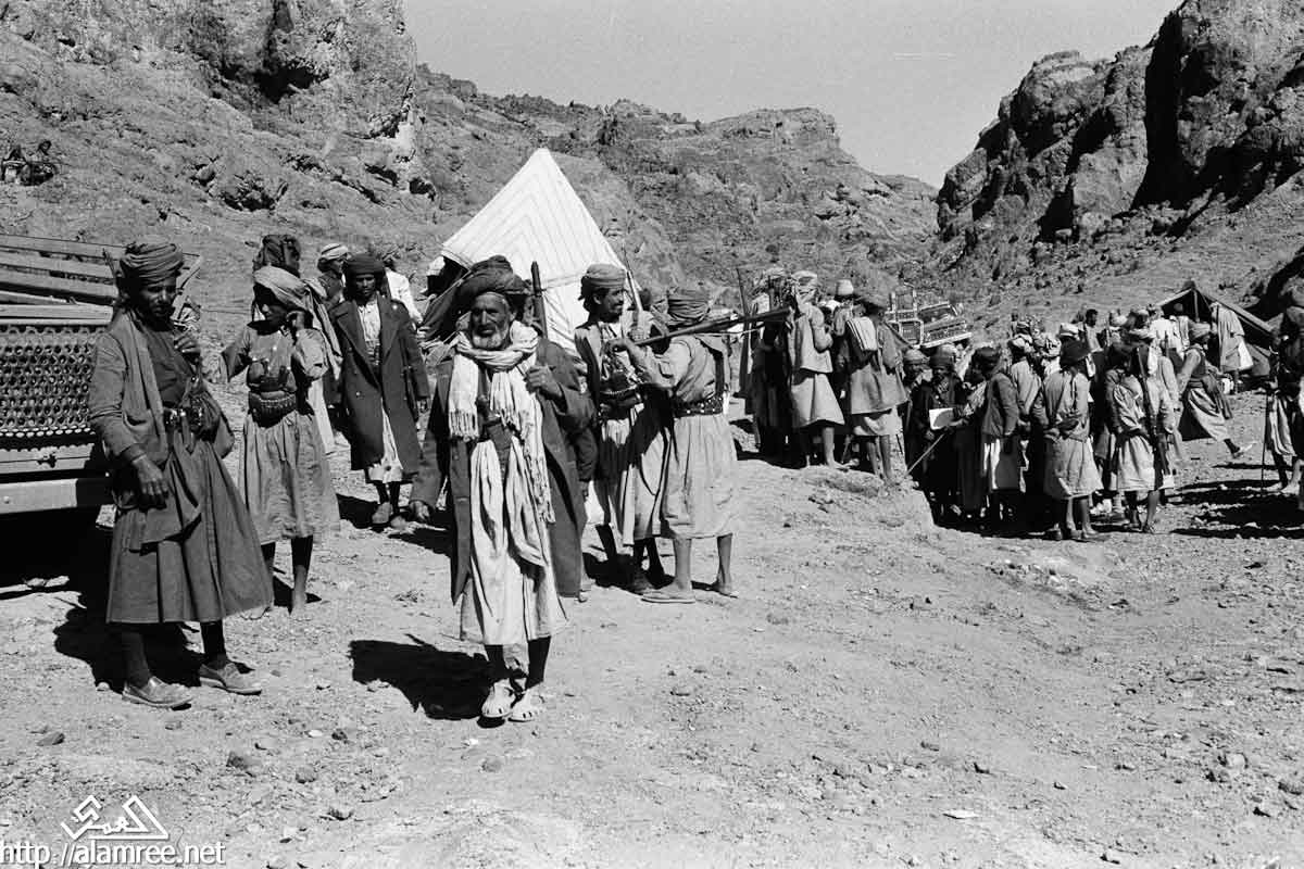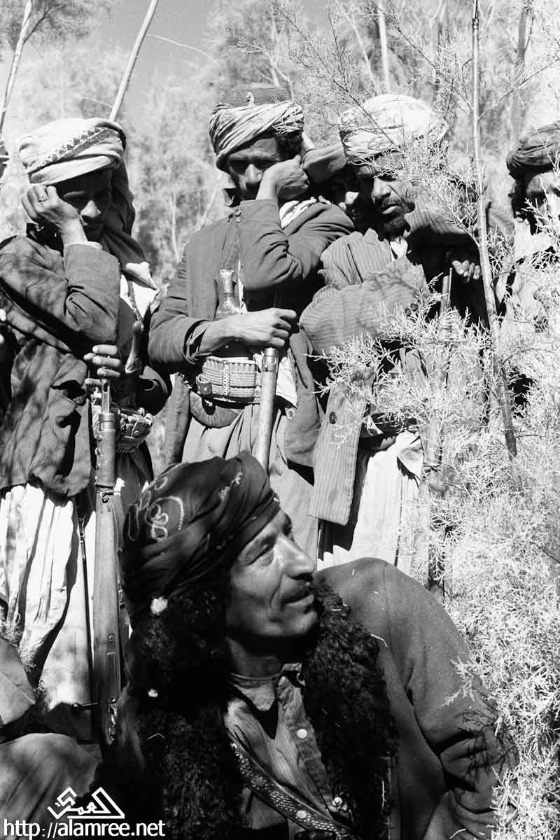 صوره لعدة رجال مسلحين ببنادق والخناجر مغمده من داخل احد معسكرات الملكيين