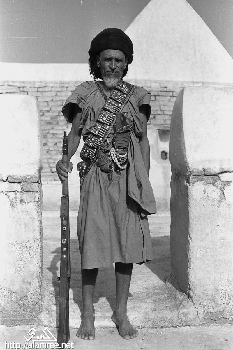 صورة لرجل عجوز يحمل بندقية ويرتدي خنجر مغمد في حزامه والماندولير حول صدره.
