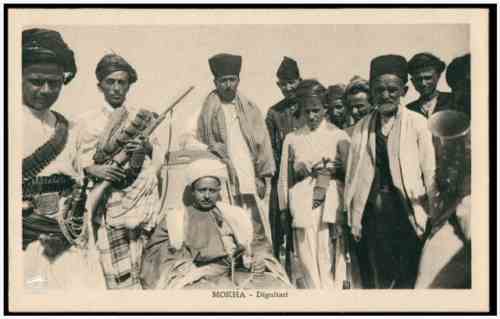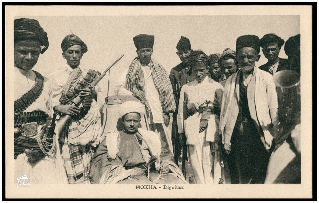مسؤولون يمنيون جنوبيون على متن السفينة "المطيرية". لاحظ العمائم ذات الطراز الهندي والخنجر المحاط بالمسبحة. عمر بحر على متن المسترية