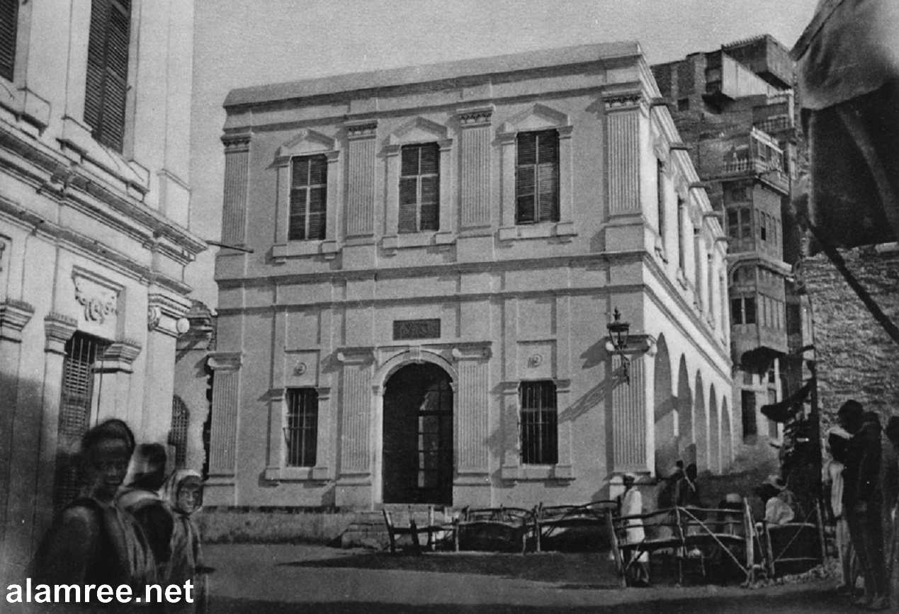 لمنظر من الشارع ويُظهر المدخل الأمامي لمبنى فاتح اللون في مكة تم وصفه بأنه المطبعة. يوحي العنوان بأنه تم إنشاء المطبعة في السنوات الأخيرة. من الواضح أن تصميم المبنى تصميم عثماني ويُشبه مبنى الحميدية