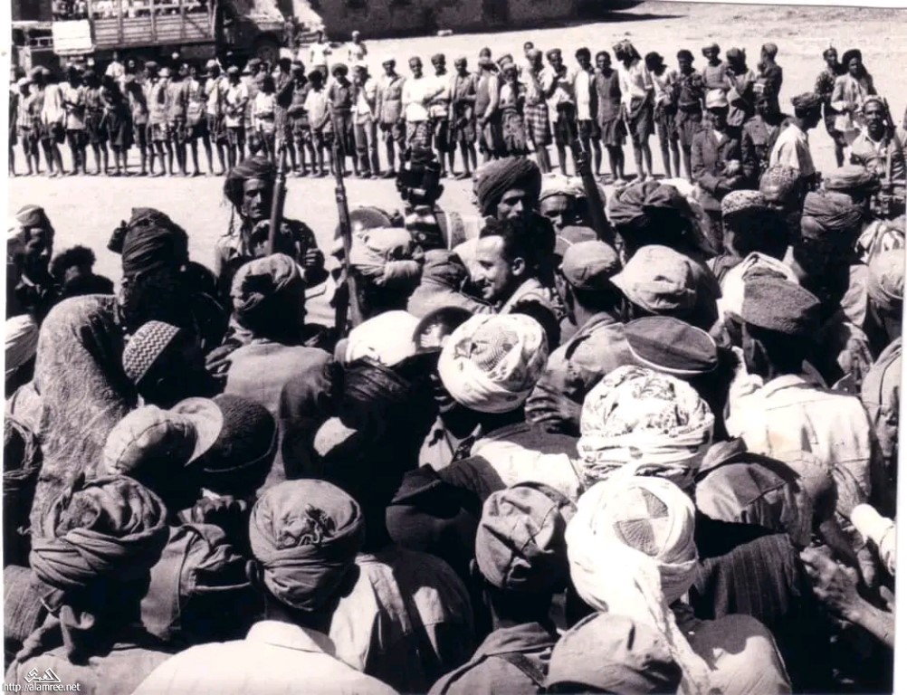 ![]() عبدالرحمن البيضاني يلقي خطابا قبل الثورة يزف فيها بشرى موافقة الامام على انشاء جيش حديث |