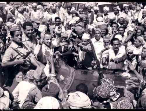 ![]() ائب رئيس مجلس الوزراء الدكتور عبد الرحمن البيضاني ، المؤيد ناصر ، تلقى ترحيبا حارا في تعز ، في محاولة لكسب الدعم للثورة. في سبتمبر 1962 |