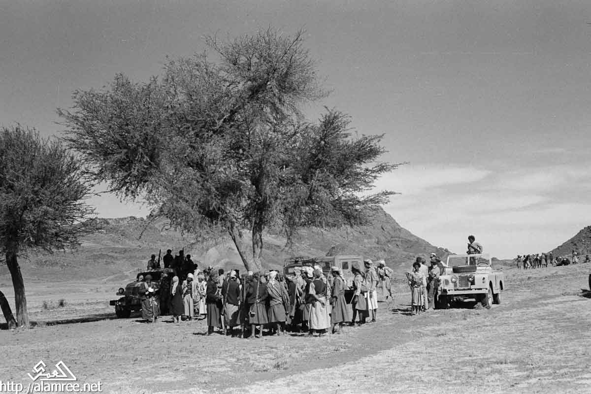 احد معسكرات الملكيين في واد صخري ويلاحظ حشد كبير من القوات الملكيه