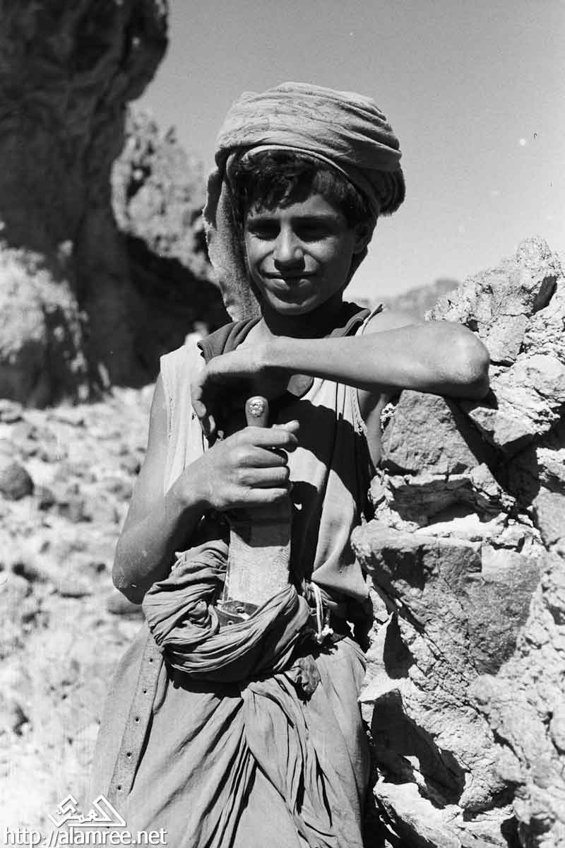 صورة لصبي بخنجر مغمد في حزامه ومنحدر الجبل في الخلفية ومعلوم استخدام الملكيين للاطفال في معاركهم