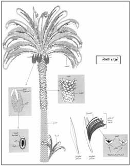 رسم تخطيطي يوضح أجزاء النخلة المختلفة